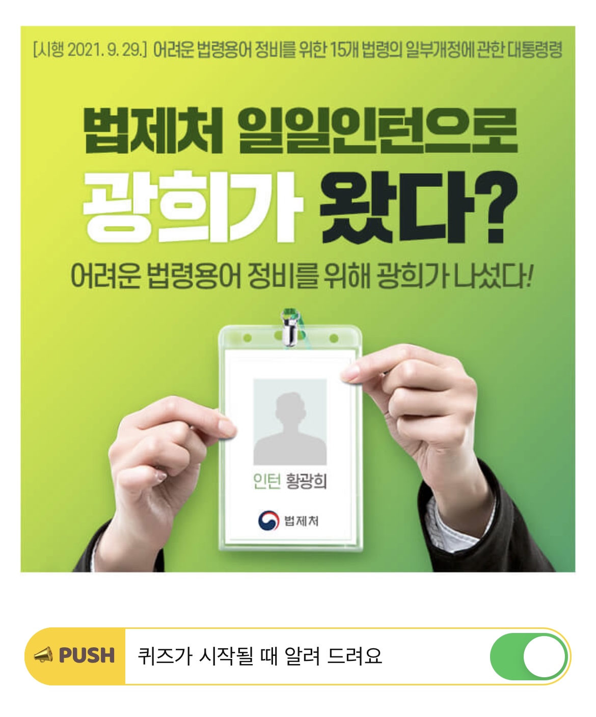 「10ㆍ27법난 피해자의 명예회복 등에 관한 법률 시행령」 제10조 각 호 외의 부분 중 “개호비(介護費)”를 “OO비”로 한다. 현행 법령 속 어려운 용어와 일본식 용어를 쉬운 우리말로 만들기 위해 “개호”를 “OO”으로 변경했습니다. OO에 들어갈 단어는 무엇일까요? (힌트 :ㄱㅂ) ★유튜브 영상과 설명란(타이틀 클릭)에서 정답을 확인해보세요.