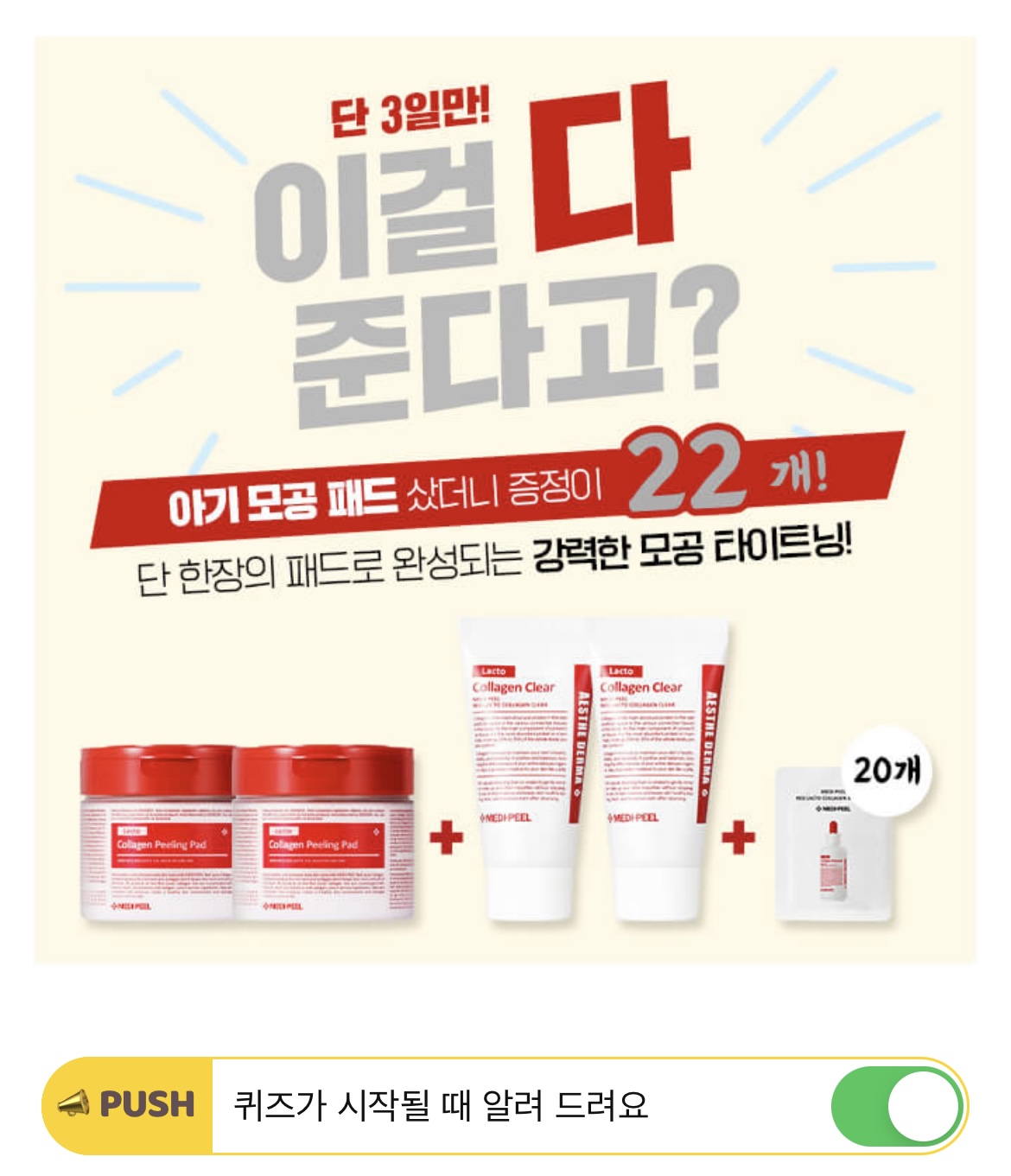 레드 락토 콜라겐 패드는 콜라겐 함유와 수분, 모공, 피지, 탄력을 케어하는 4가지 특허 성분으로 패드 한장으로 모공타이트닝과 피부결을 도와주어 일명 OOOOOO라고도 불리는데요. OOOOOO에 들어갈 단어는 무엇일까요?