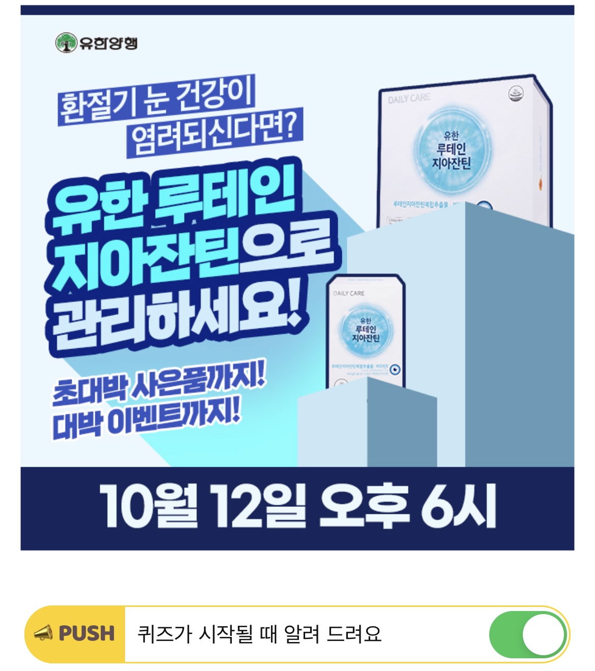 눈 건강에 도움이 되는 건강 기능식품인 유한양행의 루테인 OOOO! 눈건강 지켜보아요 . OOOO에 들어갈 내용은 무엇일까요 ?