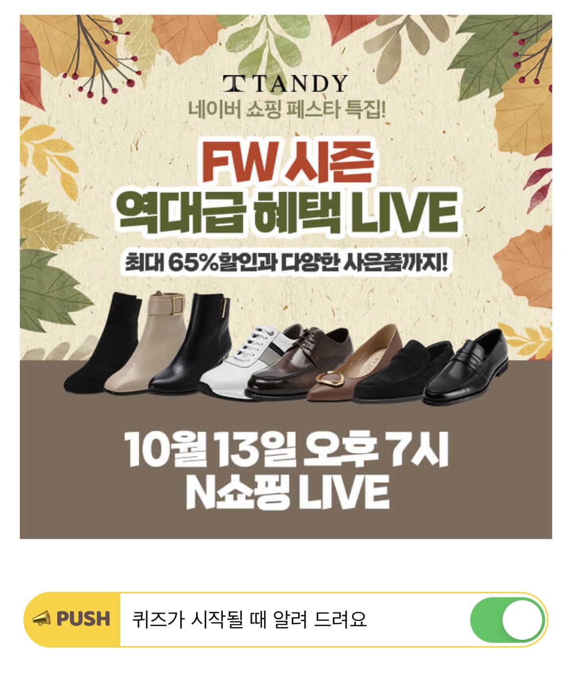 TANDY X 네이버 쇼핑 페스타 특집! OOO 앵클부츠&로퍼 FW 시즌 역대급 65% 할인! N포인트 적립부터 다양한 사은품까지! OOO에 들어갈 단어는 무엇일까요?
