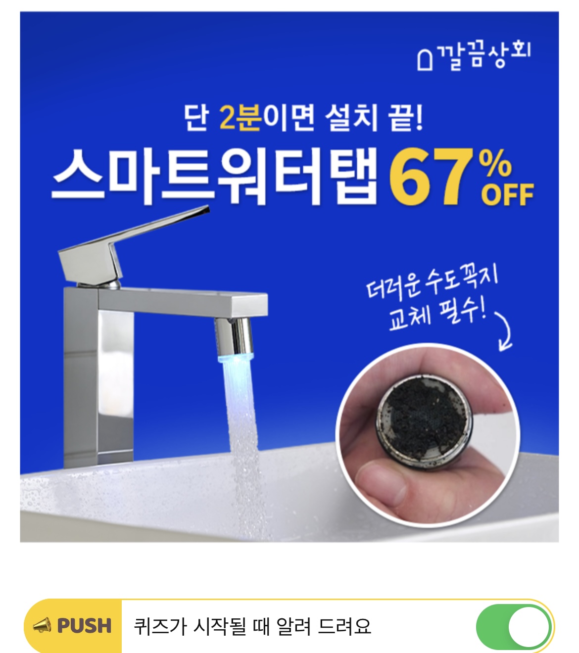 깔끔상회 스마트워터탭은 보이지 않는 미세 이물질까지, 불순물 OOOO하는 세면대 필터입니다. 여기서 OOOO에 들어갈 단어는 무엇일까요? (힌트 : ㅇㅂㅊㄷ)