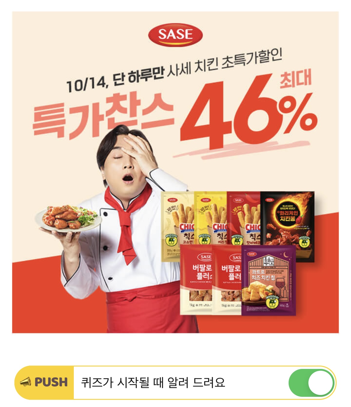 오늘 단 하루, 치킨가공품 전문관 사세에서 최대 46% 할인 특가를 진행합니다. 오늘 사세 라이브커머스에서는 베스트제품인 버팔로윙&봉과 더불어 닭가슴살로 만들어 담백하고 간편하게 즐기기 좋은 치킨스낵'OO'를 함께 판매합니다.