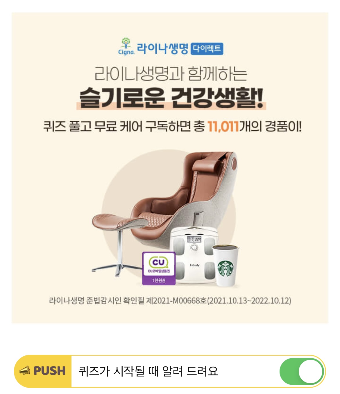 라이나생명의 OOOO OOOO 이벤트는 케어 구독 서비스 무료 구독하면 추첨을 통한 경품이 총 11,011개를 주는 이벤트 입니다. OOOOOOOO에 들어갈 말은 무엇 일까요? (초성힌트: ㅅㄱㄹㅇㄱㄱㅅㅎ)
