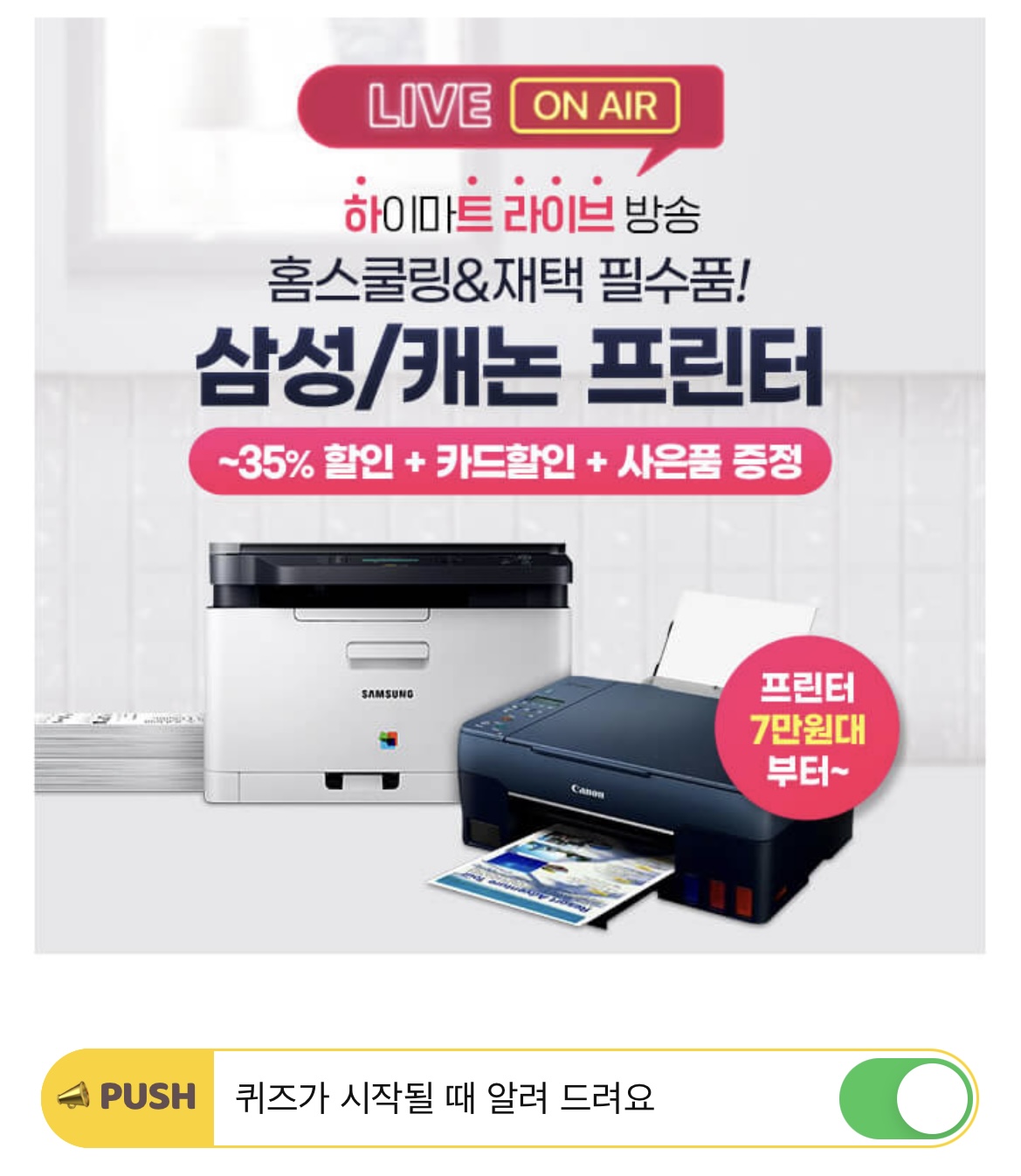 지금 하이마트 라이브방송 하트라이브에서 삼성/캐논 프린터를 최대 35% 할인하며, 청구할인 및 L.POINT 증정과 방송 중 구매 이벤트도 진행합니다.