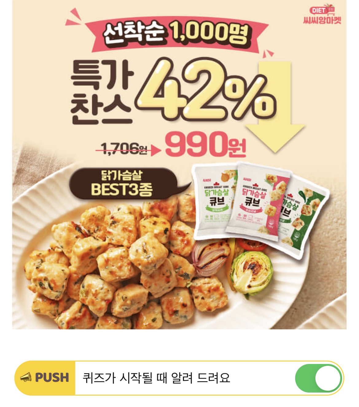 "빠른 배송에 놀랐고, 포장도 꼼꼼해 만족합니다." 이 후기는 OOO에 드레싱과 씨씨닭 큐브를 부어주기만 하면 콥샐러드를 완성할 수 있는 씨씨닭 구매자의 실제 후기입니다. 빈칸에 들어갈 단어는 무엇일까요?(힌트: ㅇㅅㅊ)