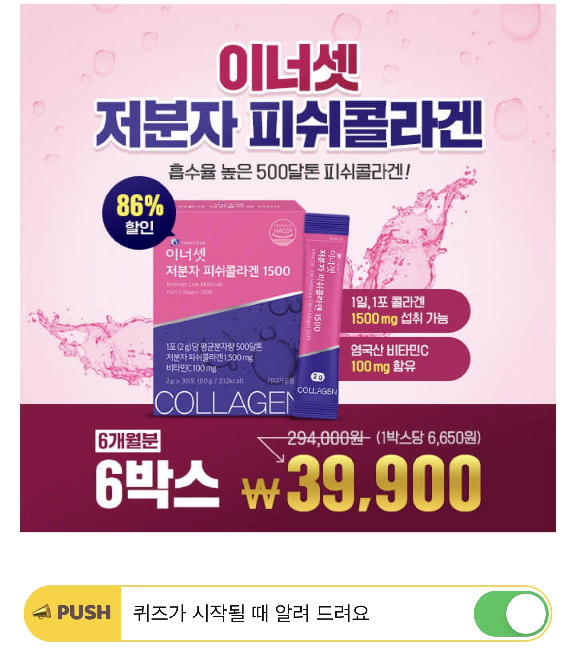 이너셋 저분자 피쉬콜라겐 1500은 영국산 비타민C가 함유되어있습니다. 콜라겐의 단백질 섬유는 3개의 폴리펩타이드 OO로 되어있는데, 이 3개의 OO이 상호 결합하기 위해서는 비타민C가 필요합니다. 여기서 OO은 무엇일까요? (힌트 : ㅅㅅ )