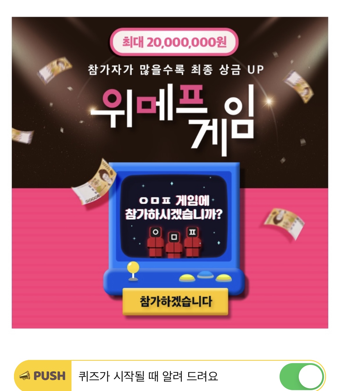 위메프게임에 참가하시겠습니까? 최종 상금 최대 2천만원의 주인공이 될 수 있는 기회! 참가자 모집 기간은 OO월 OO일 까지입니다. 빈칸에 들어갈 숫자는 무엇일까요?