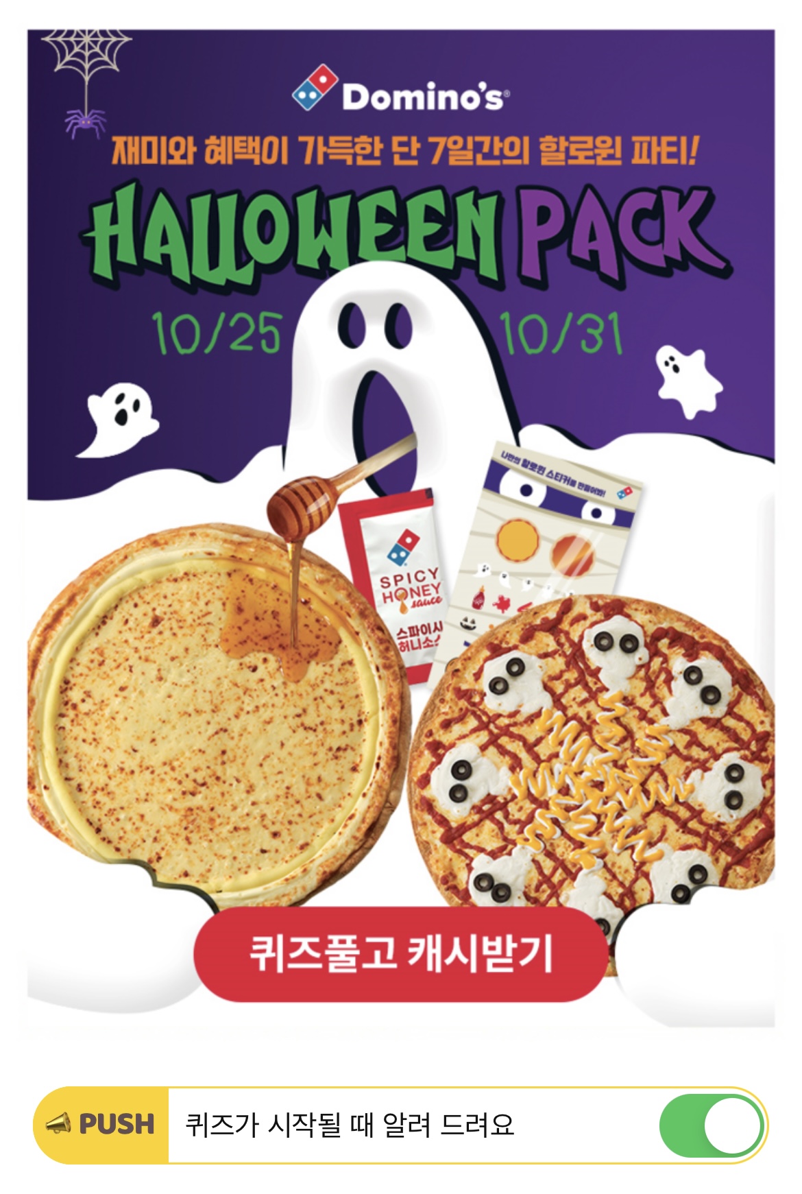 ‘도미노 할로윈 팩’은 고스트 할로윈 피자와 OOO OO OOO피자, DIY 스티커와 스파이시 허니 소스로 구성되어 있습니다.