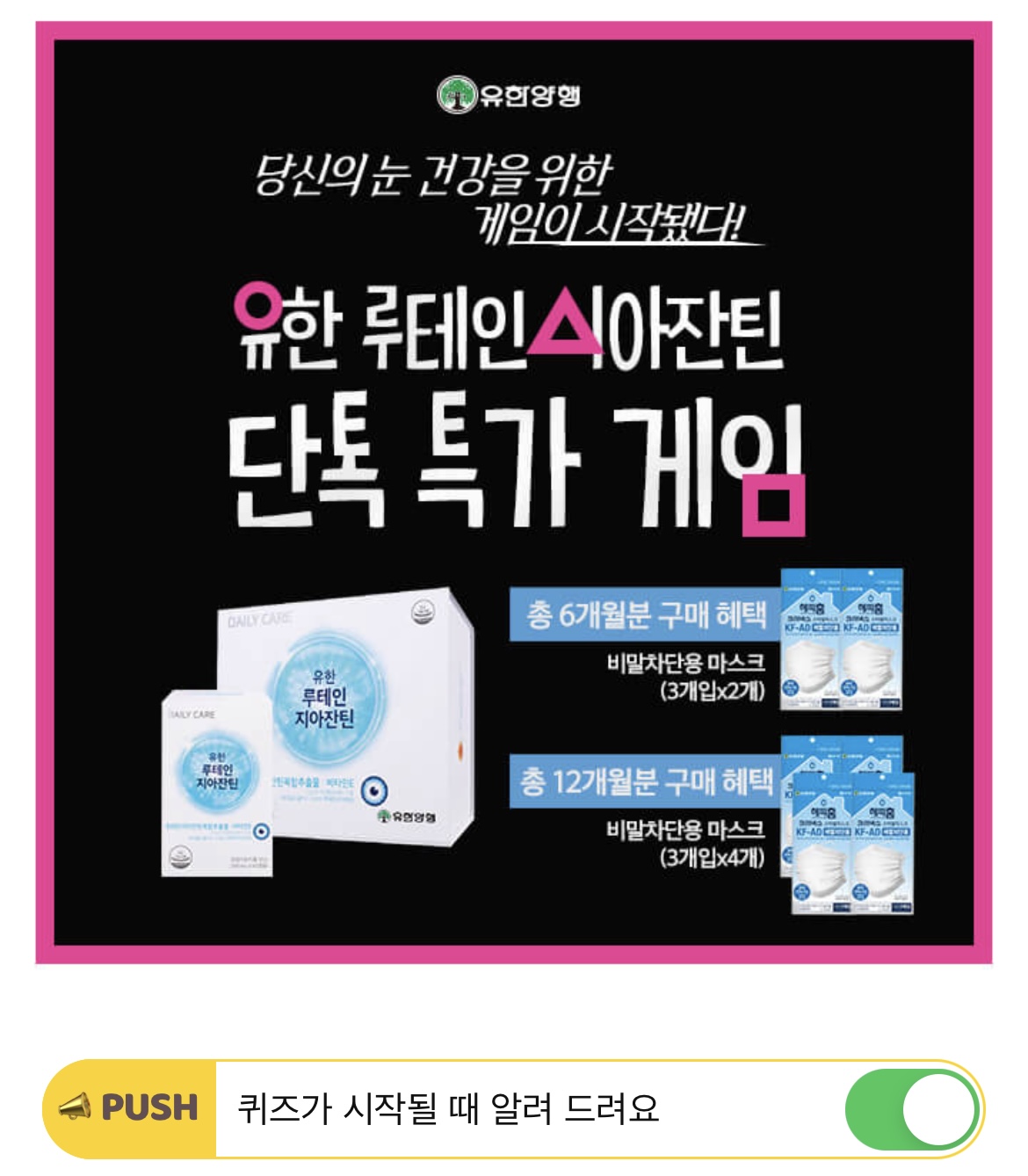 유한 루테인지아잔틴은 눈의 노화가 걱정되거나 OO OO OO가 많은 직장인들에게 추천됩니다. OOOOOO에 들어갈 단어는 무엇일까요? (영문+한글)