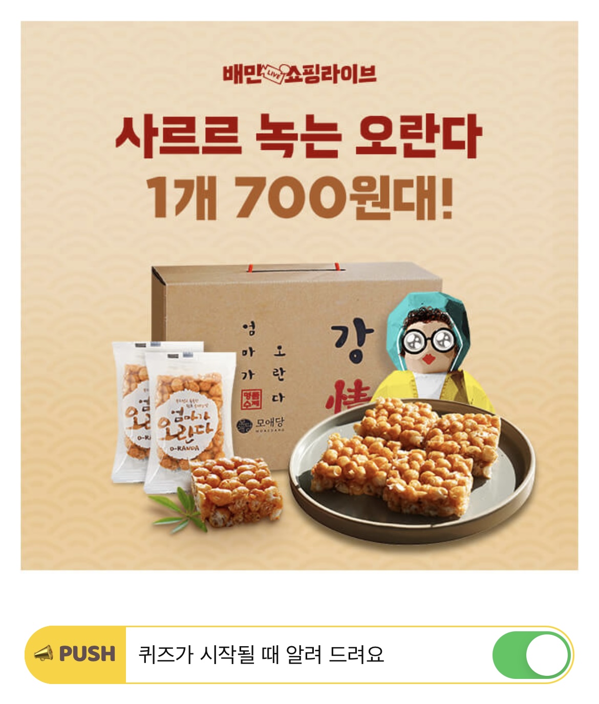 딱딱하지 않아 사르르 녹는 OOO오란다를 1박스 9800원에 드려요! 아이부터 어른들 간식으로 딱 좋은 오란다 맛집! OOO에 들어갈 말은 무엇일까요?