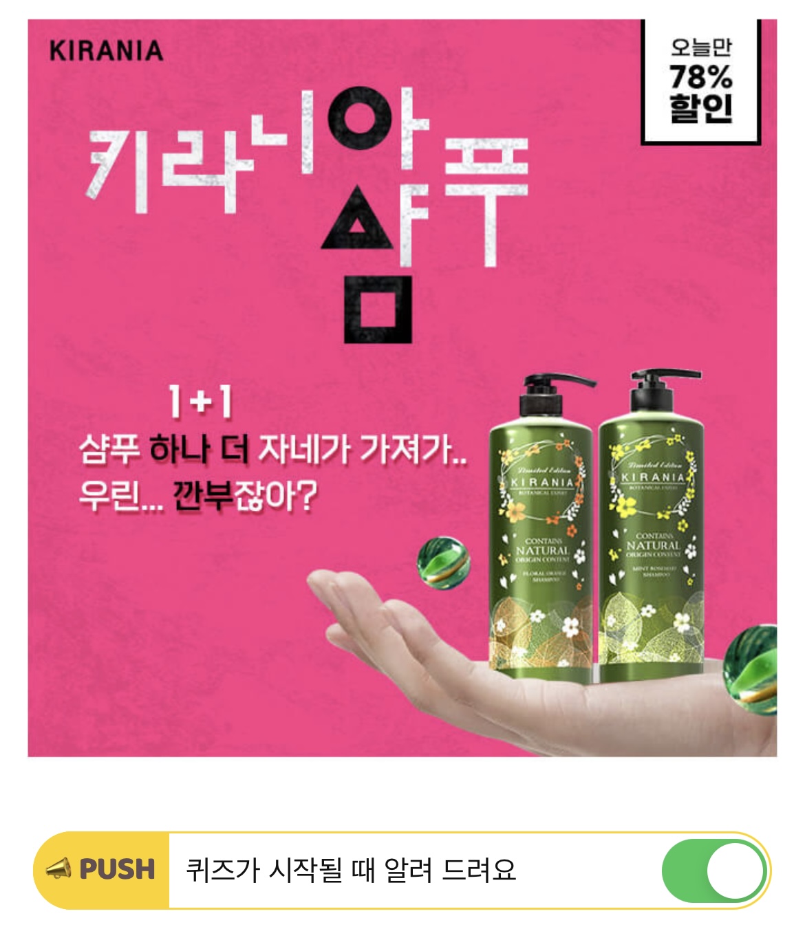 키라니아 대표상품인 보타니컬 샴푸는 두피의 모공을 막아 트러블을 유발하는 실리콘성분을 빼고 OOOO을 첨가해 100%자연유래성분으로 만들어진 전성분 EWG그린등급 천연샴푸입니다. 한 고객은 "두피트러블이 많아 고민이었는데 실리콘오일이 아닌 OOOO이 들어가있어 구매했어요 트러블도 줄고 시원합니다"라고 후기를 남겼는데요! OOOO은 무엇일까요? (ㅊㅇㅇㅇ)