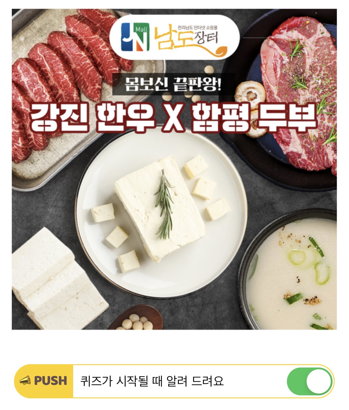 남도장터 코리아세일페스타에서는 강진 한우&함평 두부를 라이브특가와 농활쿠폰 20% 추가혜택까지 전부~드립니다! 지금 바로! 라이브방송에서 ★한우1+ 등심 26,320원 / 수제두부 2모 5,900원★을 모두 무료배송으로 챙겨가세요! 오늘은 OOOO입니다. 한우와 두부를 라이브특가로 만나보세요! 빈칸에 들어갈 단어는 무엇일까요? (힌트 : ㅎㅇㄷㅇ)