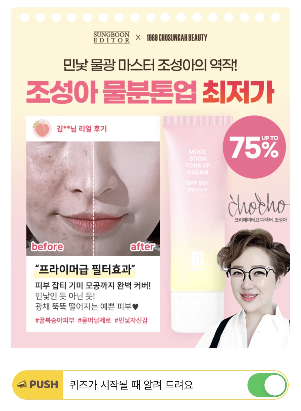 조성아 물분톤업은 피부진정, 피지조절에 좋은 자연유래 ㅇㅇㅇ파우더를 사용해 자연스러운 톤업 효과를 줍니다. 복숭아빛 자연스러운 물광톤업의 비밀 성분 ㅇㅇㅇ에 들어갈 단어는 무엇일까요? (초성힌트: ㅋㄹㅁ)