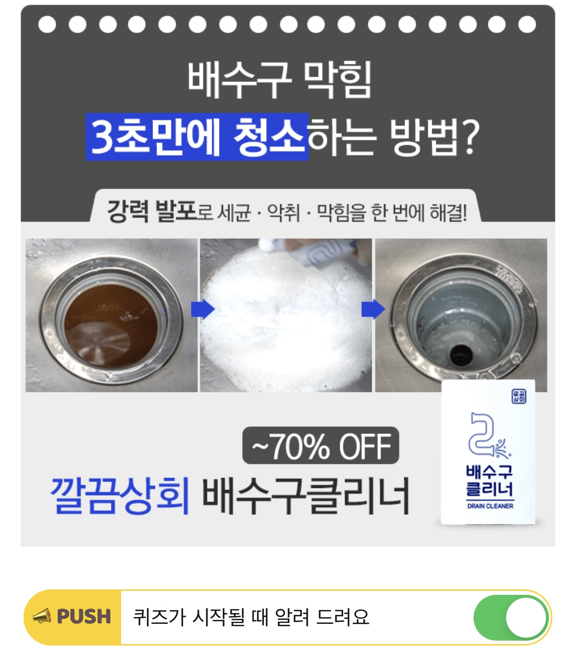 "깔끔상회"에서 출시한 신제품 깔끔상회 배수구클리너는 OOO로 인해 겨울에 더 심해지는 배수구 악취를 잡아주는 제품입니다. OOO에 들어갈 말은 무엇일까요? (초성힌트 : ㄱㅇㅊ)