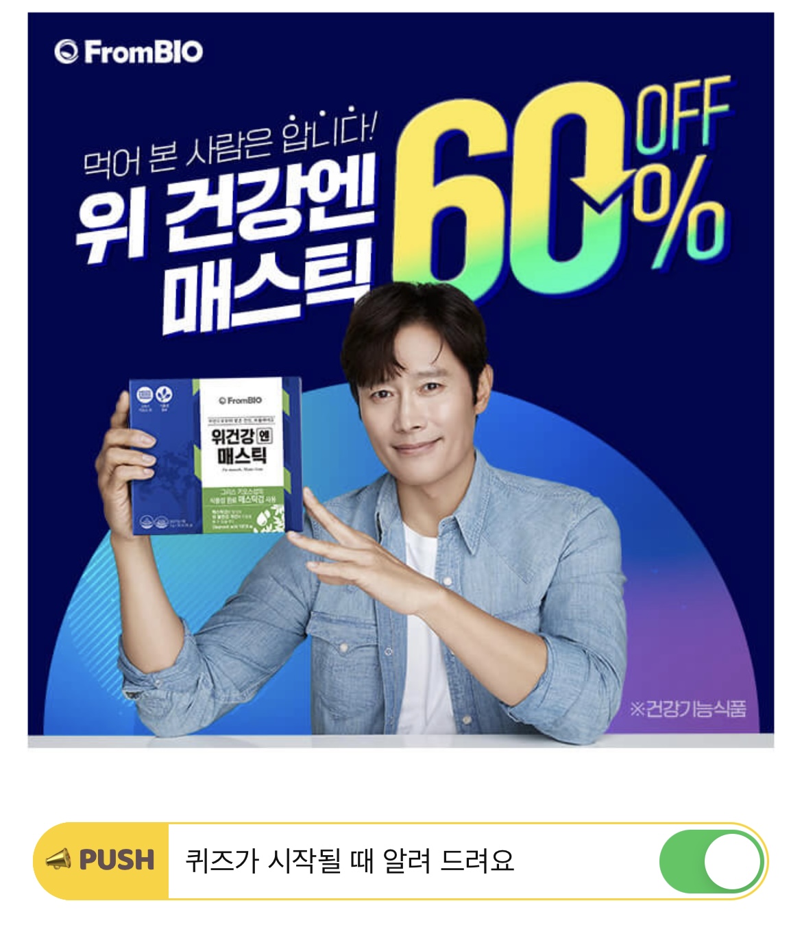 현대인의 필수품! 위 불편감 개선에 도움을 줄 수 있는 OOOO OOO. 그리스 키오스섬의 식물성 원료 매스틱검을 사용한 OOOO OOO은 무엇일까요? (힌트 : ㅇㄱㄱㅇ ㅁㅅㅌ)