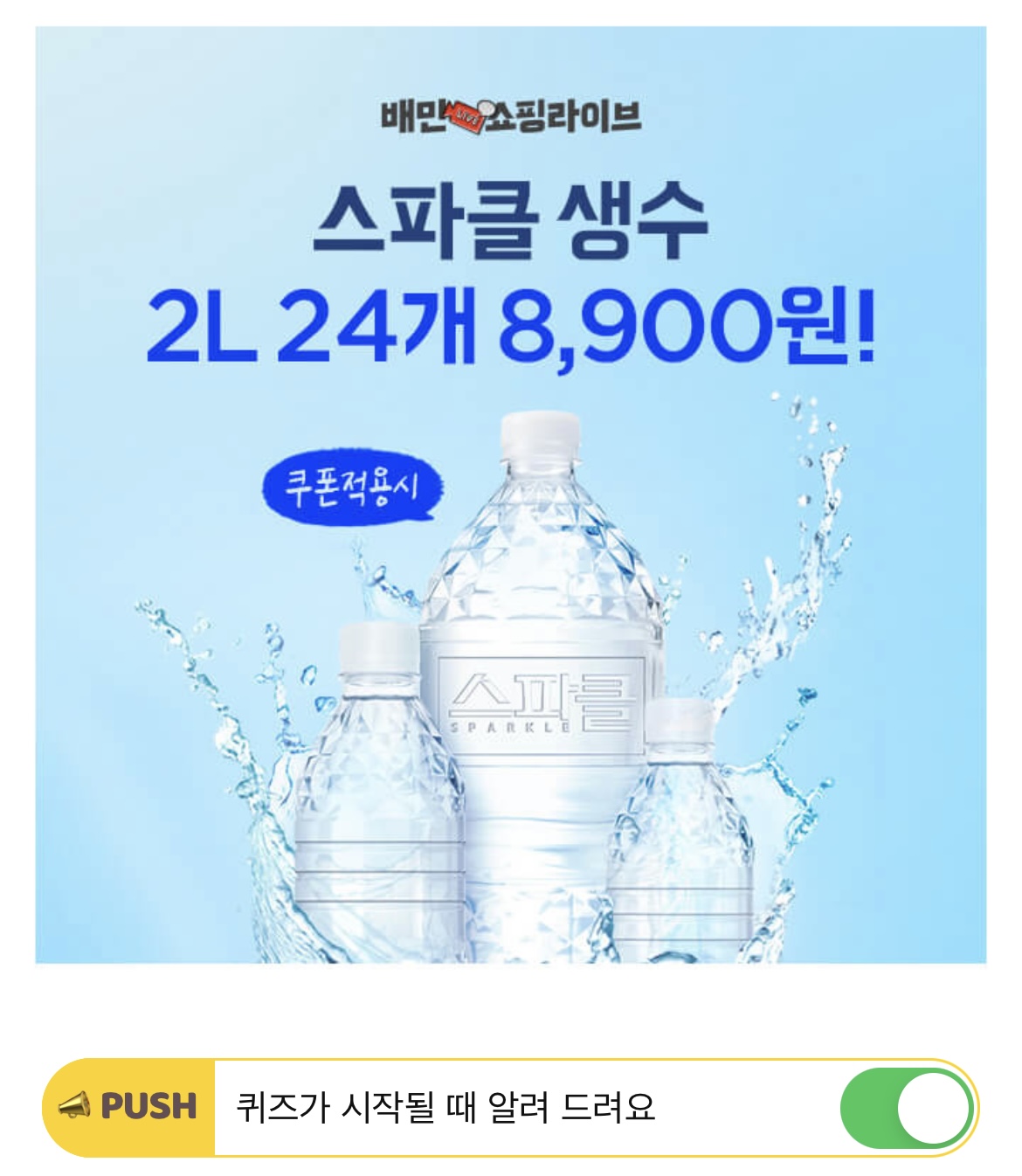 생수가 필요할 땐 스파클! 오늘 스파클은 딱 1시간 방송 동안에만 생수 O병을 덤으로 드려요! O에 들어갈 숫자는 무엇일까요?