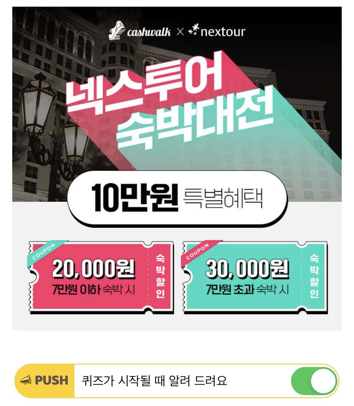 국민 누구나! 이벤트 기간 동안 오전 OO시 오픈되는 넥스투어 숙박대전 쿠폰을 다운 받으면 할인쿠폰, 투어캐쉬 등 최대 10만원 상당의 혜택이 제공됩니다.