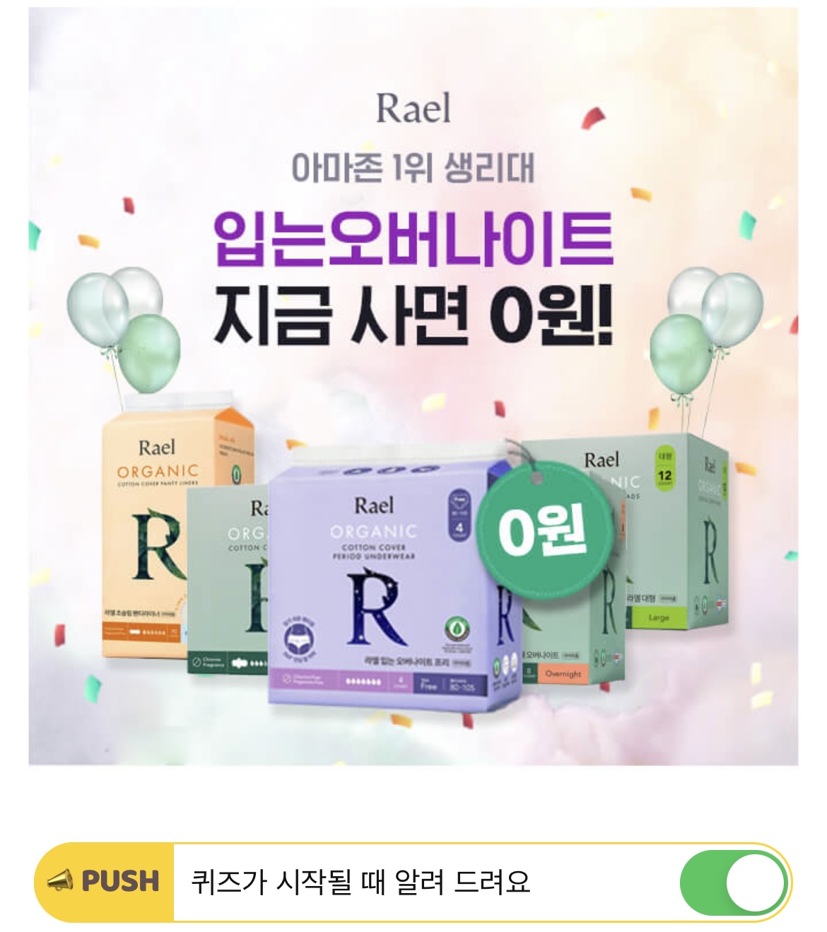 지금 라엘몰에서는 올해 최대 할인 행사인 OOOOO를 진행중입니다. OOOOO 행사에는 8월 런칭 이후 21만개나 판매된 '입는오버나이트'를 0원에 드리는 타임딜을 진행하고 있는데요. OOOOO에 들어갈 단어는 무엇일까요? (힌트 : ㅂㄹㄷㅇㅋ)