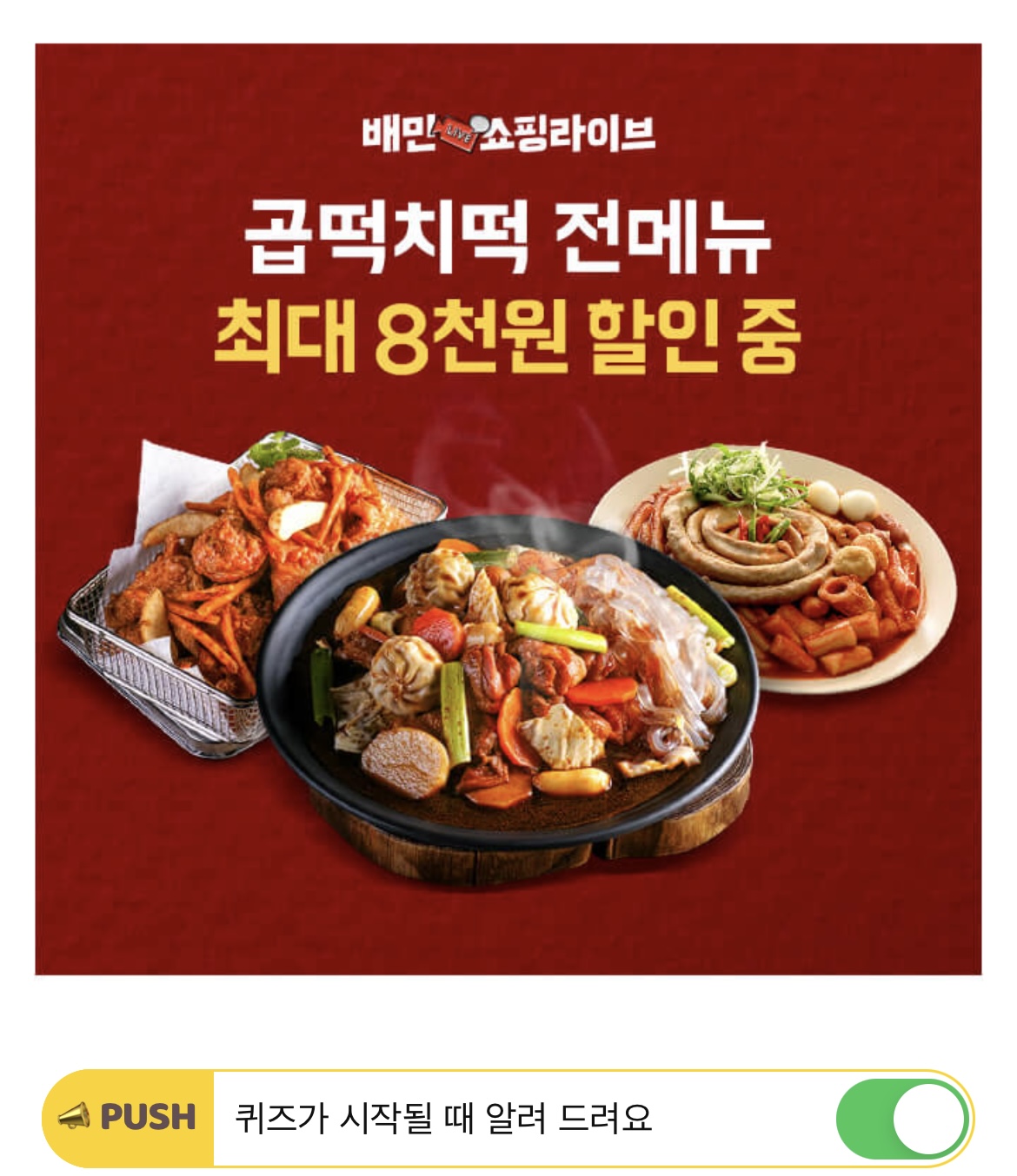 배민쇼핑라이브에서 곱떡치떡, 치꼬뱅, OOOO까지! 모두 사용 가능한 상품권을 8천원 할인합니다! 찜딱이 메인 브랜드인 OOOO의 이름은 무엇일까요?