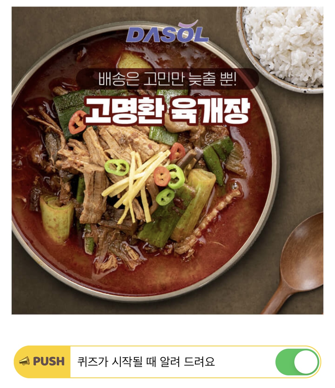 2시 팔도유람에서는 대전광역시 우수상품을 더욱 더 홍보하기 위하여, 대전광역시와 대전일자리경제진흥원에서 지원을 하여 라이브를 준비하였습니다! 62만 푸드크레이터 맛상무님과 개그맨 OOO님이 라이브방송 중 OOO의 뜻밖에 육개장을 ★4팩에 12,900원★과 무료배송으로 소개드리고 있습니다!! OOO에 공통으로 들어갈 단어는 무엇일까요?