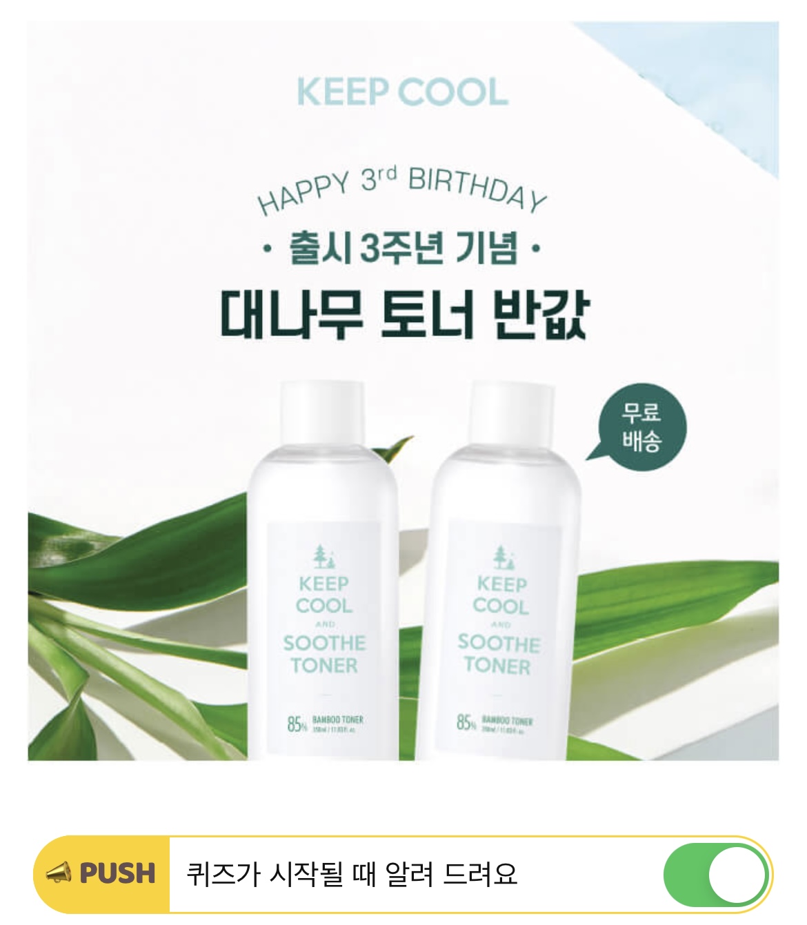 킵쿨 수드 대나무 토너의 출시 3주년을 맞이하여 역대급으로 진행되는 이번 대나무 토너 반값 이벤트는 단 72시간 동안 50%할인에 OOOO으로 진행됩니다. 여기서 빈칸에 들어갈 단어는 무엇일까요? (힌트 : ㅁㄹㅂㅅ)