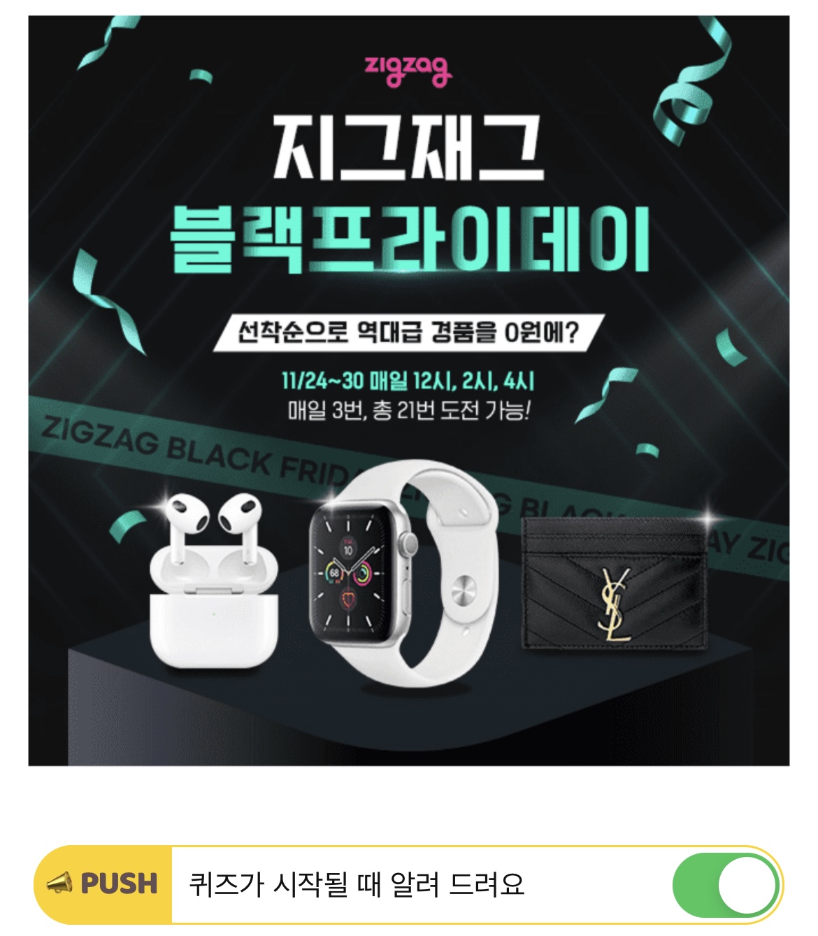 블랙프라이데이를 맞아 지그재그는 11월 24일부터 30일, 일주일 간 매일 1시, 3시, 5시에 열리는 퀴즈이벤트를 통해 직잭러 선착순 1,000명에게 100% 선물을 제공합니다. 해당 퀴즈 이벤트의 총 상금 OOOO만원! 여기서 빈칸에 들어갈 숫자는 무엇일까요?