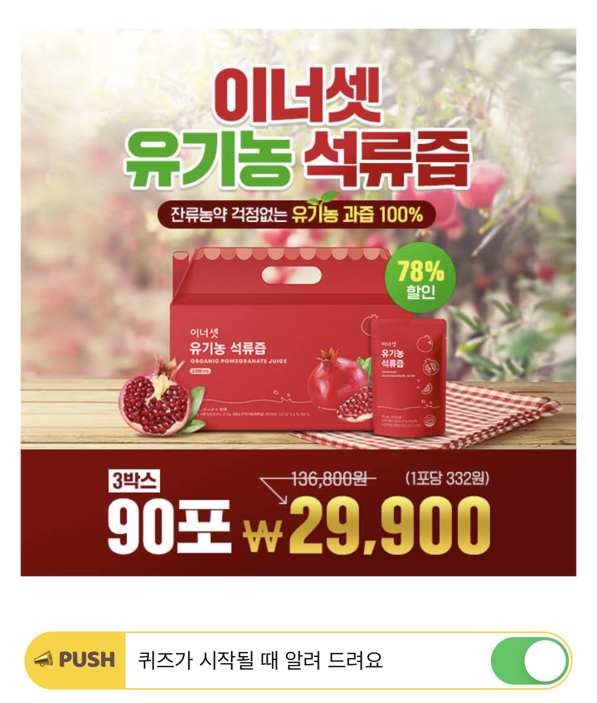 이너셋 유기농 석류즙은 화학비료와 유기합성농약을 사용하지 않았으며 농림축산식품부에서 지정한 인증기관이 가공식품의 사용원료와 제조공정을 심사하는제도인 OOOOO인증을 받은 제품입니다. 여기에 OOOOOO에 들어갈 단어는 무엇일까요?(초성힌트 : ㅇㄱㄱㄱㅅㅍ)