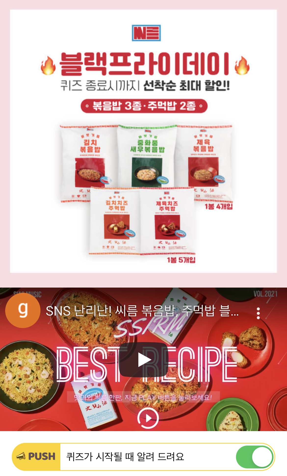블랙프라이데이 20% 특별할인을 진행하는 씨름의 스테디셀러 볶음밥은 'OOOO'로 풍미를 낸 화유/파유 기름으로 만들었습니다. 여기서 빈칸에 들어갈 단어는 무엇일까요? (힌트 : ㅊㅇㅈㄹ)