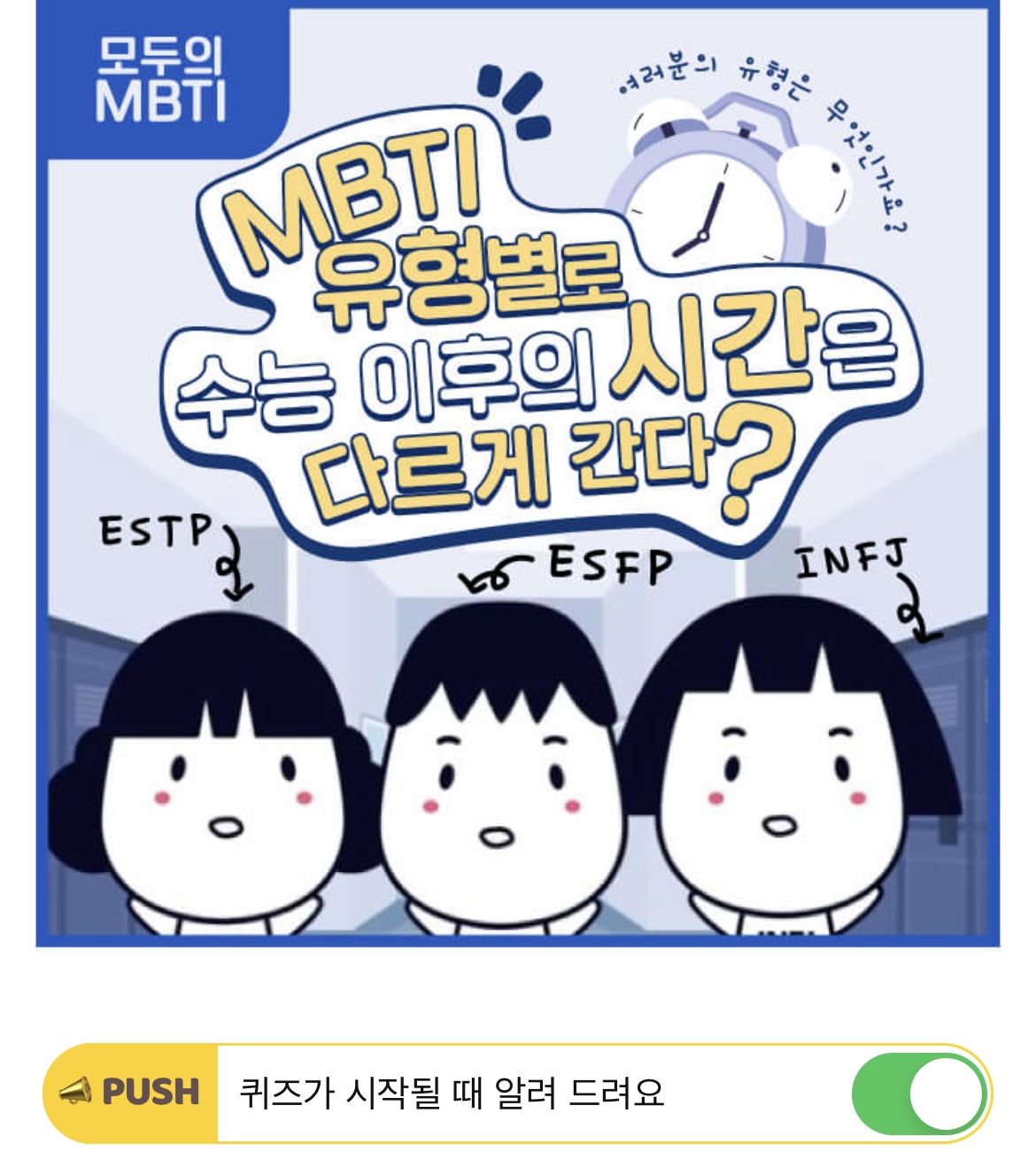 교육부가 공개한 'OOOO 유형으로 살펴보는 수능 이후 시간을 보내는 방법!' 빈칸에 들어갈 영문은 무엇일까요?