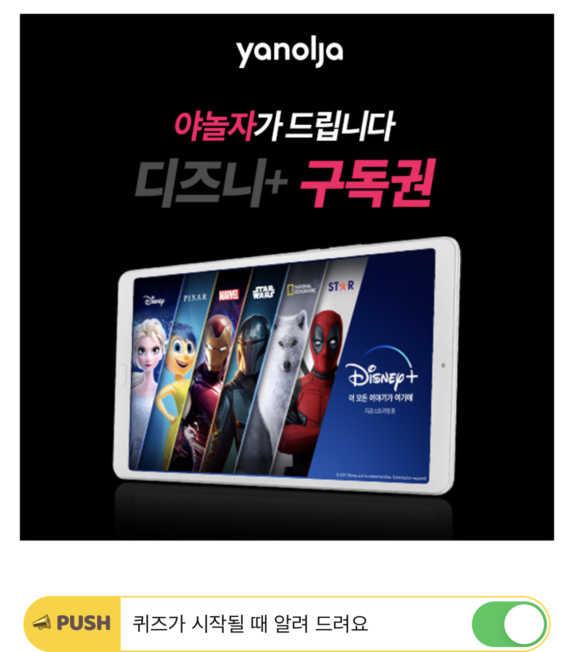 야놀자가 파격 연말 선물을 드려요! 만화부터 다큐멘터리까지, 요즘 남녀노소에게 인기 만점인 디즈니+ 구독권 야놀자가 통크게 6개월권 쏩니다!