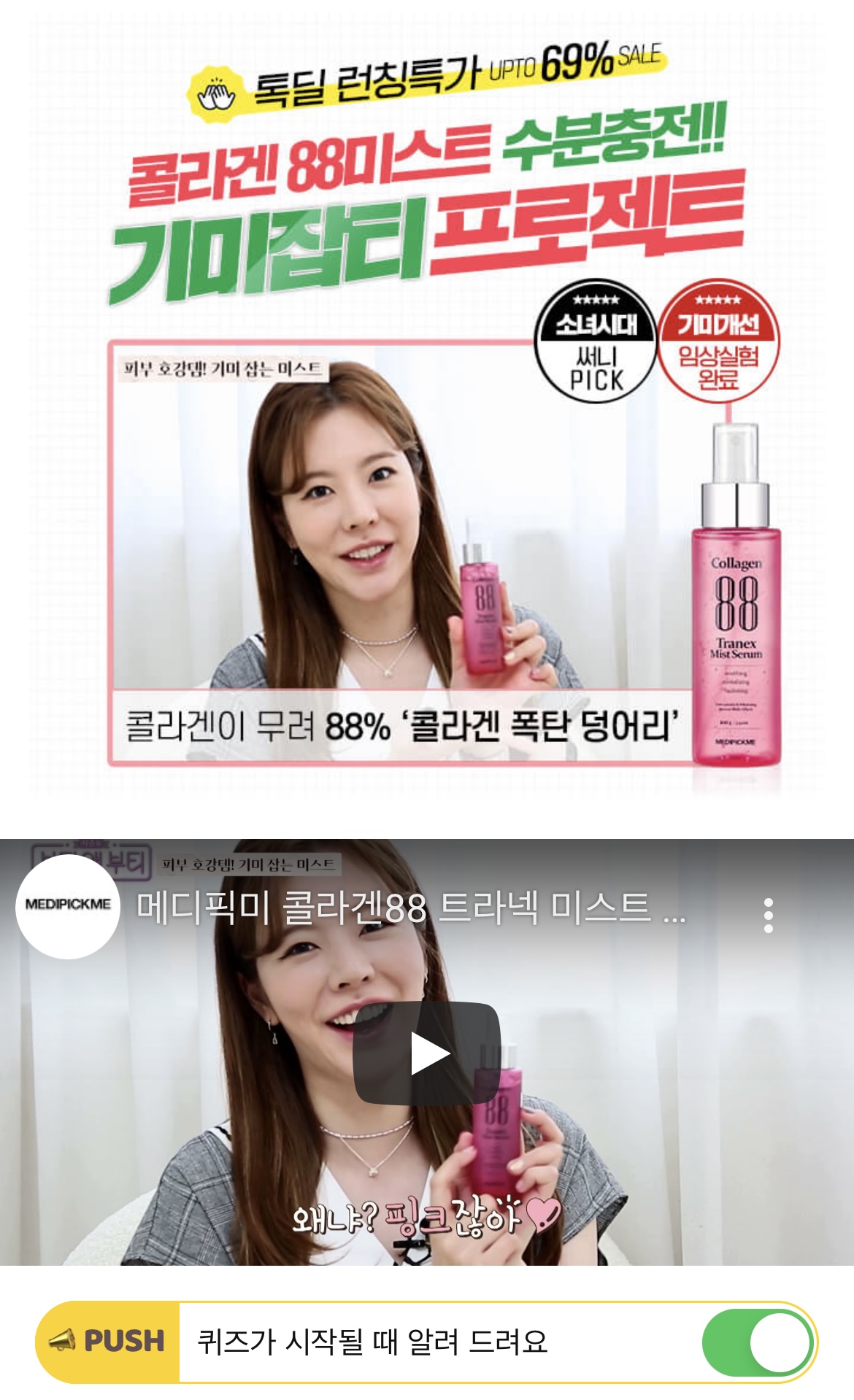 뷰티윈도 1위를 기록하고 카카오 톡딜에 상륙한 메디픽미 콜라겐 미스트! 메디픽미 콜라겐 88 트라넥 미스트 세럼은 수분접착제라고 불릴 정도로 ○○에 뛰어난 미스트 인데요. 일반 동물성 콜라겐이 아니라 피부 흡수력이 뛰어난 저분자 마린콜라겐이 함유되어 있어서 ○○에 효과적이라고 합니다. ○○은 무엇일까요?