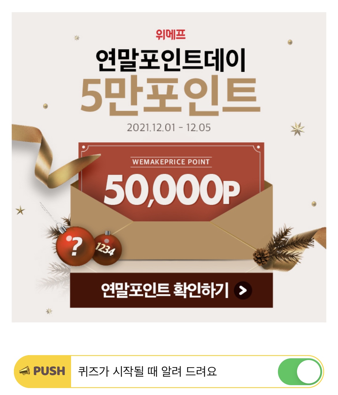연말포인트데이의 스페셜 혜택! 매일 오전/오후 11시에 한정수량으로 50% 특가가 오픈됩니다. 12월 5일에 오픈되는 상품은 OOOO 1만원권입니다. 5천원에 구매할 수 있는, 빈칸에 들어갈 상품은 무엇일까요? (힌트 : ㄹㄷㄹㅇ)