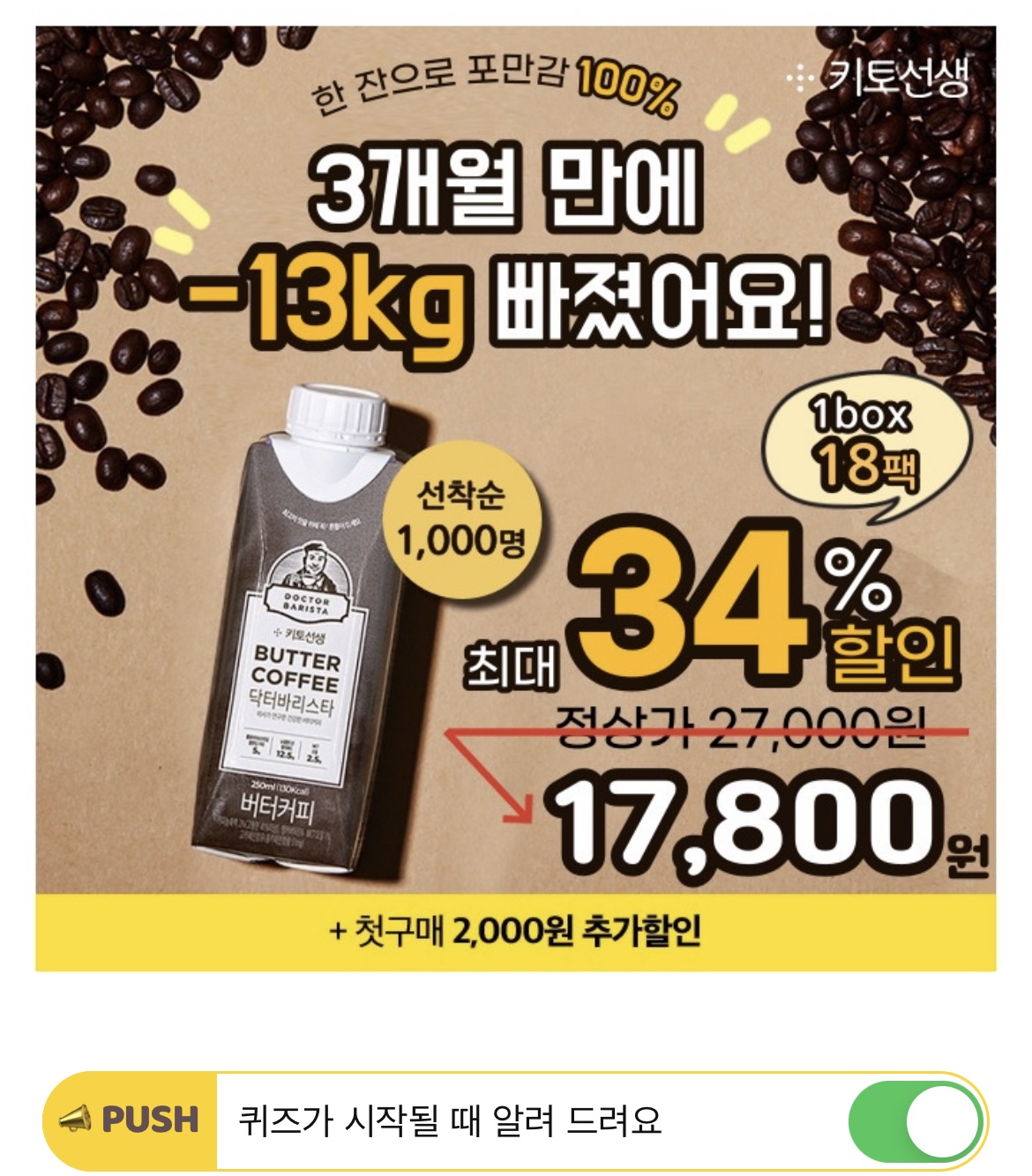 "최고 몸무게 찍고 다이어트하려고 꾸준히 마셨습니다. 벌써 4회차 구매인데 지금은 55kg으로 총 13kg 감량해서 초고도비만 탈출했습니다!" 이 내용은 N쇼핑 '방탄커피' OOOO 닥터바리스타 후기입니다. OOOO은 무엇일까요?