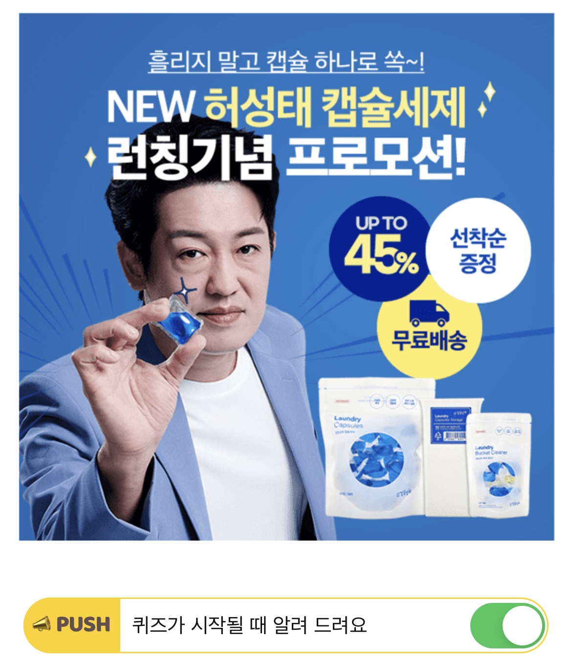 깔끔상회 캡슐세제는 현재 런칭 혜택으로 OOOOO를 선착순 증정하고 있습니다. 여기서 OOOOO에 들어갈 말은 무엇일까요? (힌트 : ㅋㅅㅂㄱㅎ)