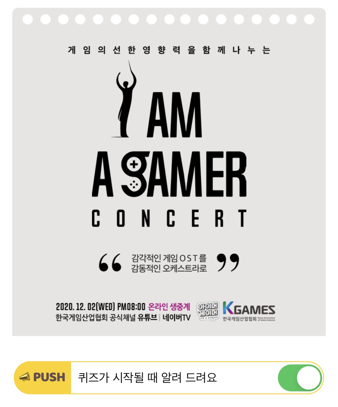 게임의 선한 영향력을 함께 나누는 K- game 오케스트라 콘서트의 주최는 어디일까요? (초성힌트: ㅎㄱㄱㅇㅅㅇㅎㅎ, 제목 옆 아래 화살표를 눌러주세요.)