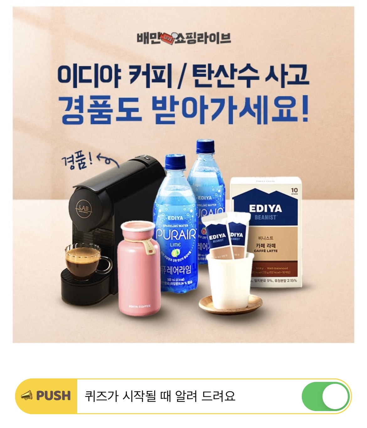 이디야로 즐기는 홈카페! 황금비율 탄산음료 퓨에어와 오리지널 커피, 핸드드립 까지! 오늘 최대 OO% 할인한 가격에 판매합니다. OO에 들어갈 숫자는 무엇일까요?