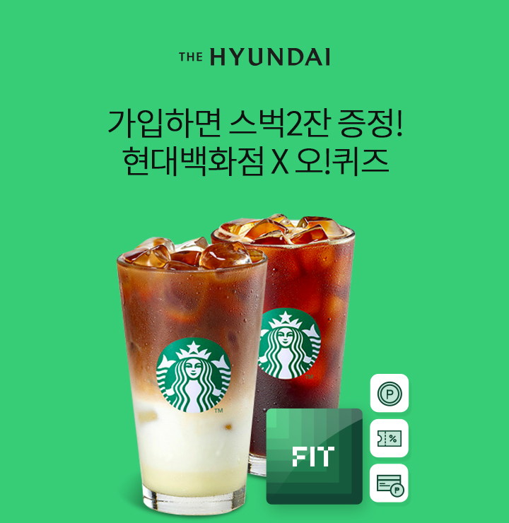 문제 : 지금 OK캐쉬백 앱 이벤트 페이지를 통해 현대백화점 FIT 모바일카드 신규 가입 시 ○○○○ 커피 2잔을 무료로 받을 수 있습니다.