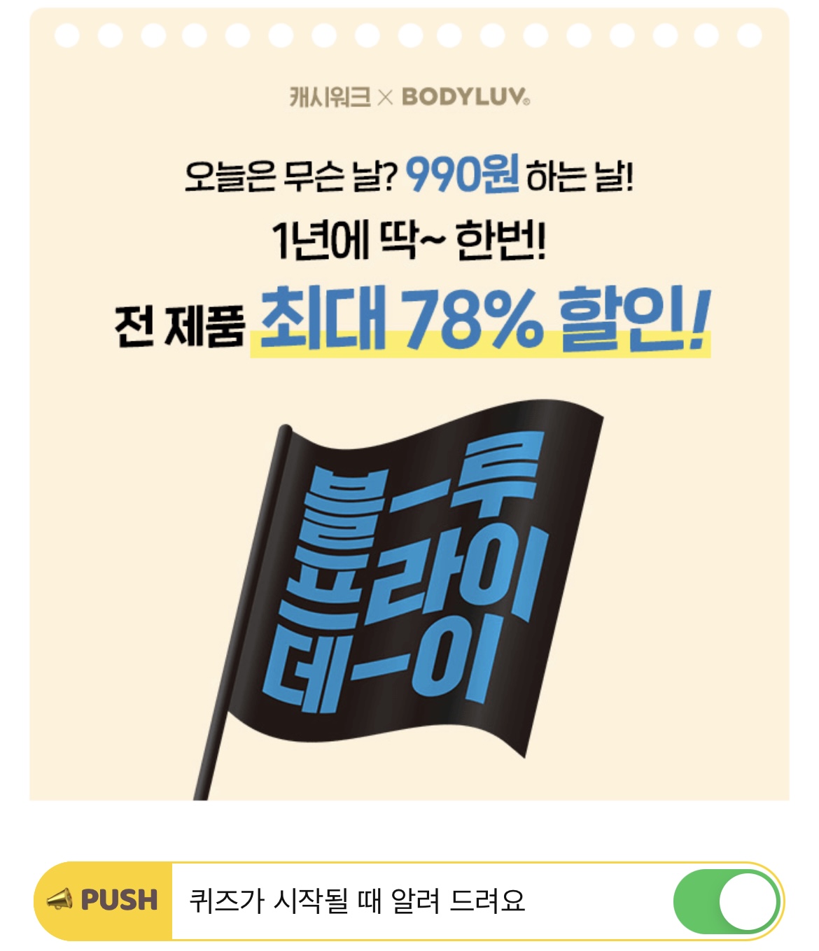 바디럽 블루프라이데이 기간 동안 총 5가지 제품을 990원에 만나보실 수 있는 OOOO 타임 세일 이벤트를 진행하고 있습니다. OOOO에 들어갈 단어는 무엇일까요?
