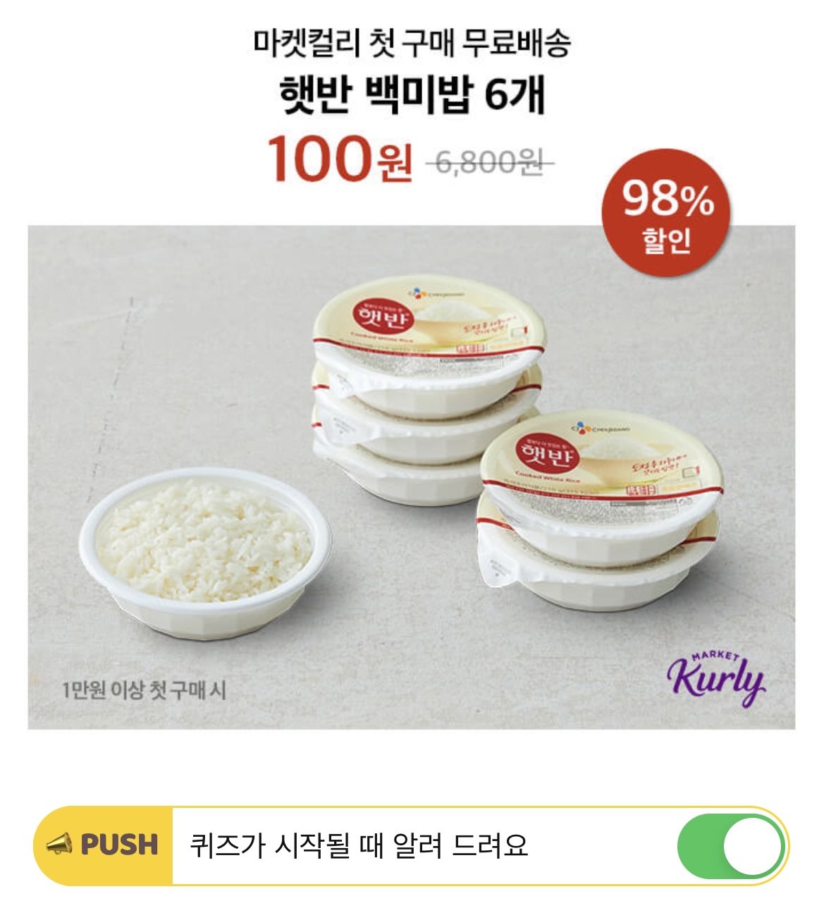 마켓컬리에서 첫 OO하면 요즘 핫한 상품을 100원부터 득템 가능! 'OO'에 들어갈 단어는 무엇일까요?