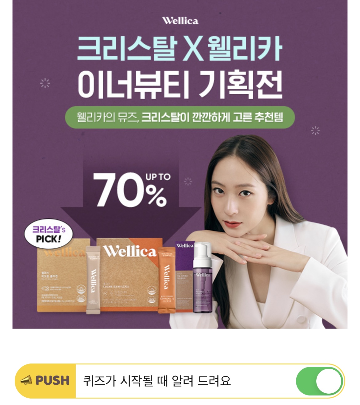 크리스탈은 건강한 피부를 위해 웰리카의 피부개선 2중 기능성 OOO 콜라겐을 먹고 있는데요. OOO에 들어갈 단어는 무엇일까요? (힌트 : ㅂㅇㅌ)