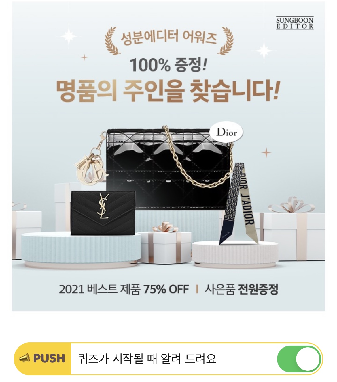 성분에디터는 '2021 성분에디터 어워즈'를 맞이하여 고객 관심과 사랑에 보답하기 위해 명품 역조공 이벤트를 진행합니다. 이 중 OOOOO 구매자 전원에게 10% 할인 쿠폰을 증정하는 사은품 혜택이 제공되는데요. 빈칸에 들어갈 단어는 무엇일까요? (힌트 : ㅂㅅㅌㅅㄹ)