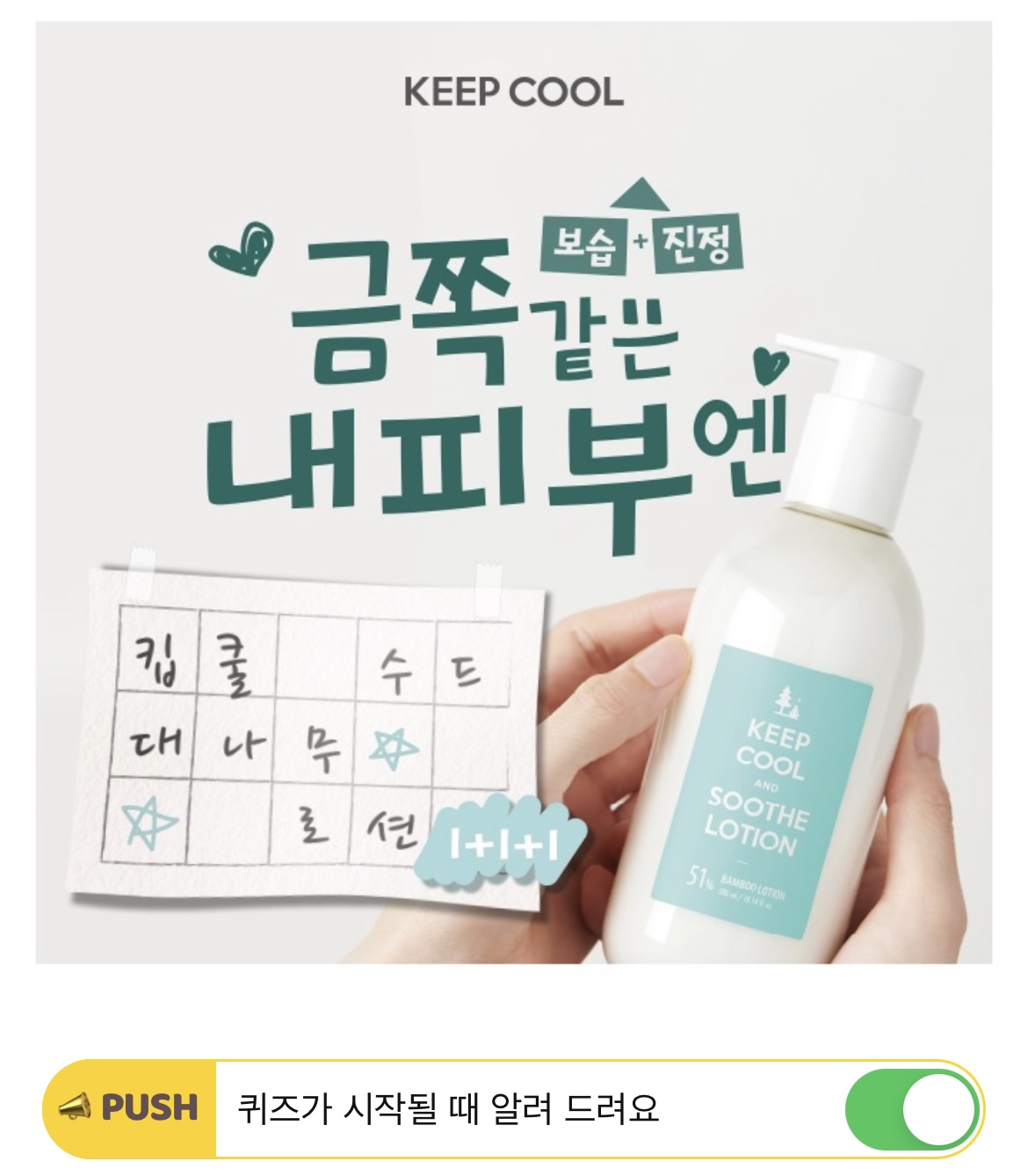 킵쿨 수드 대나무 로션은 다른 보습제품들과는 달리 피부 진정에 효과적인 대나무수를 51%나 함유하고, 에센스와 크림의 중간 체형인 플루이드 텍스쳐로 도포시 기름지지 않고 촉촉하게 흡수되어 2차 성징으로 피부 고민이 많은 OOO 자녀를 둔 학부모님께 추천드리는 제품입니다.