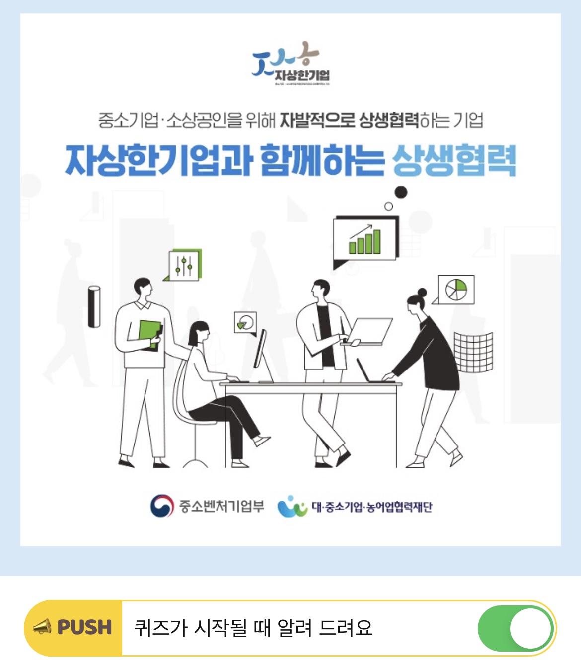 'OOO OO'은 '자발적 상생협력 기업'으로 '19년 네이버를 시작으로 현재까지 35개의 기업들이 선정되어 대·중소기업 간 새로운 상생협력의 길을 만들어가고 있습니다. 여기서 빈칸에 들어갈 단어는 무엇일까요?(힌트 : ㅈㅅㅎㄱㅇ)
