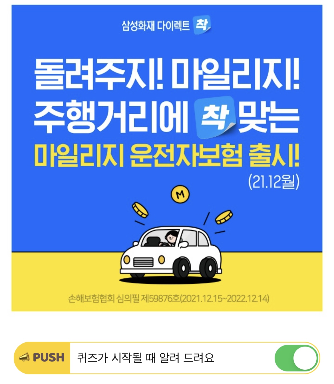 새로 출시된 삼성화재 다이렉트 OOOO 운전자보험은 적게 탄 만큼 포인트로 돌려받을 수 있는 포인트백형 보험입니다. 여기서, OOOO에 들어갈 단어는 무엇일까요? (힌트 : ㅁㅇㄹㅈ)