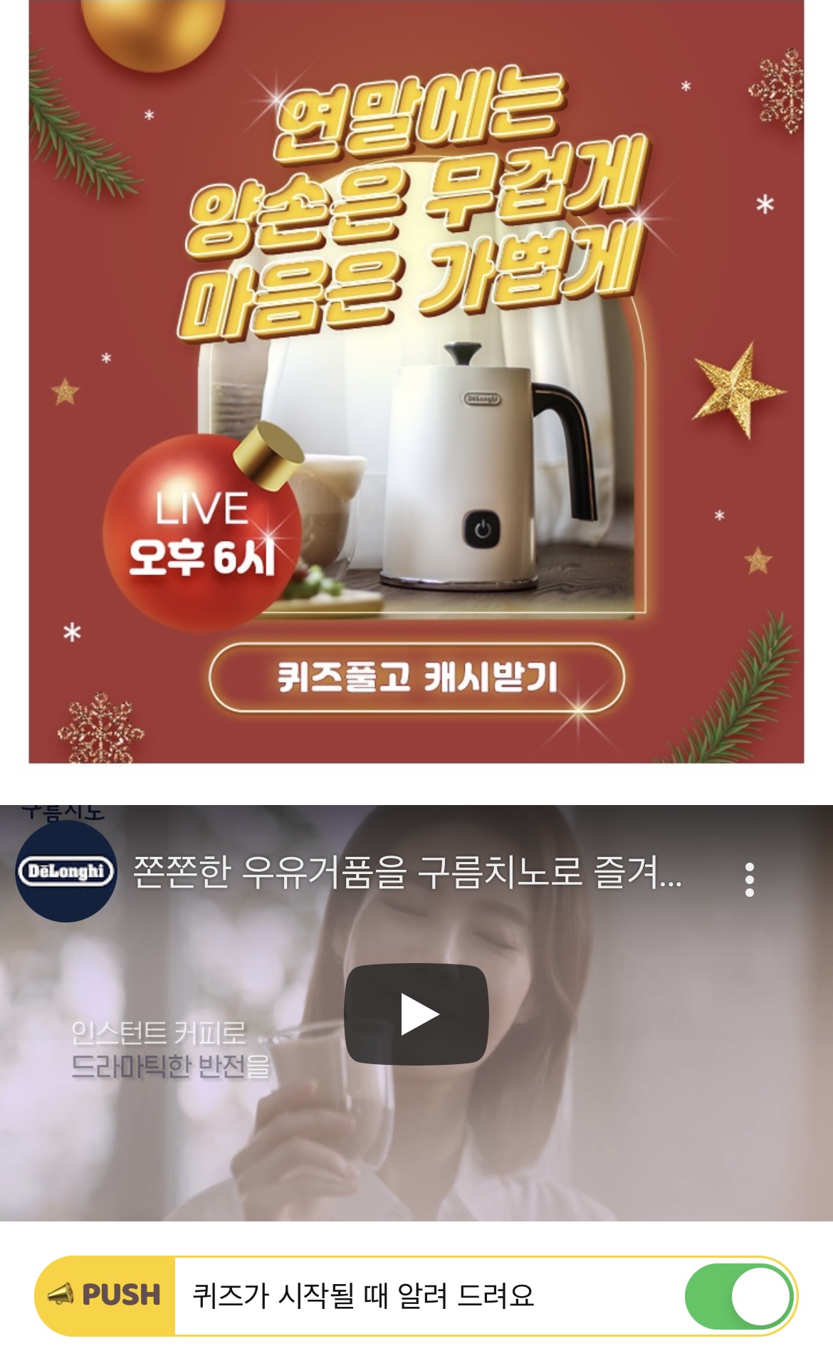 드롱기 구름치노 우유 거품기는 버튼 하나로 OOO 타입의 우유거품을 만들 수 있고, 따뜻한 우유를 만들기에도 편리합니다. OOO에 들어갈 단어는 무엇일까요? (힌트 : ㅅㄱㅈ)