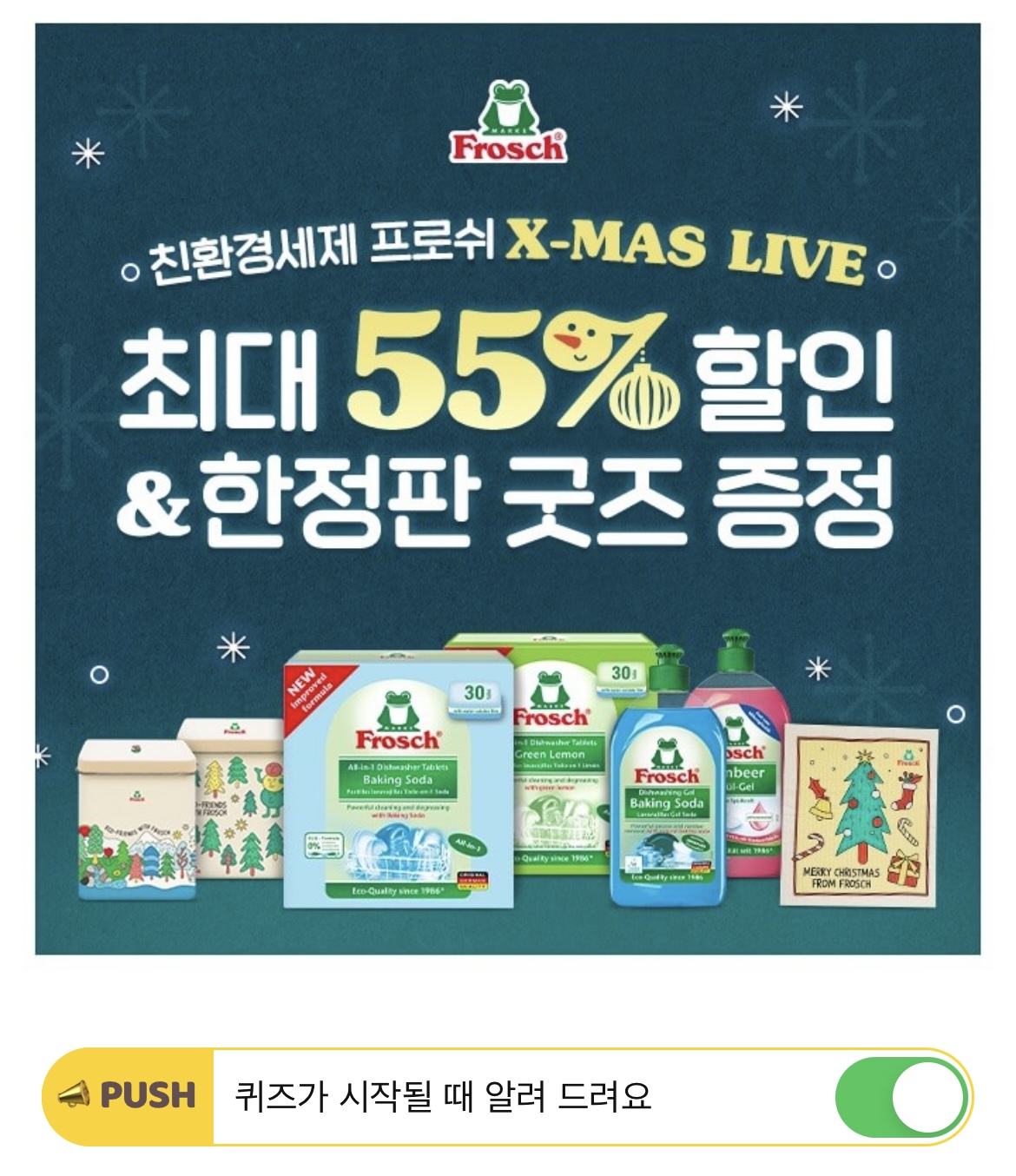 식기세척기 세제 국내 판매 1위를 기록하고 있는 친환경 개구리 세제 프로쉬의 ' OOO청소템' 라이브 방송 시간 동안 프로쉬 제품을 구매하면 한정판 스페셜 굿즈인 틴케이스와 행주를 선물로 드립니다!