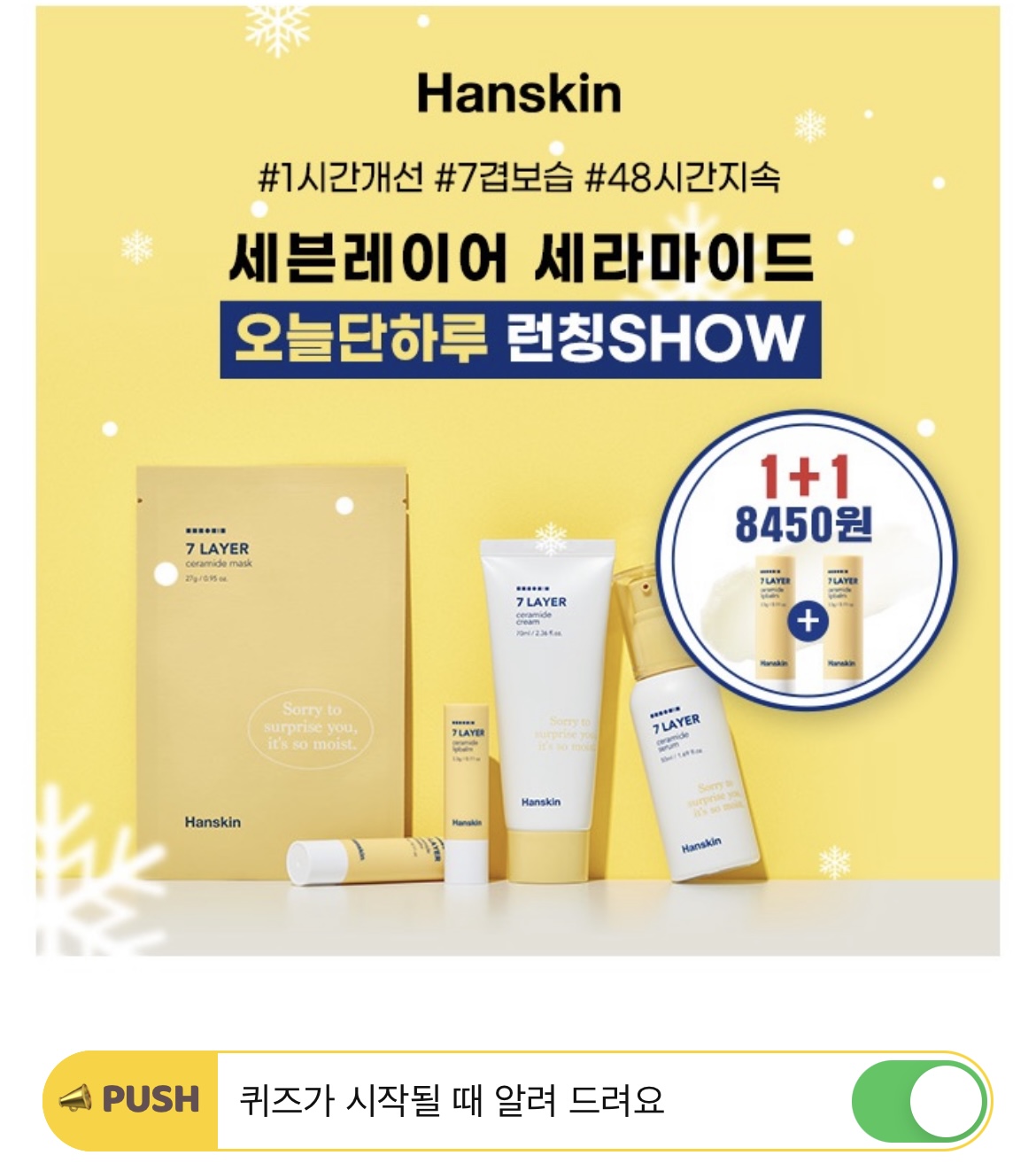 지금 한스킨 라이브방송에서는 선착순 배송비체험 이벤트중! 시간이 지날수록 부족해져 피부를 건조하게 만드는 OOOOO 충전을 위해 한스킨이 출시한 겨울 최고의 보습템! #7겹보습 #48시간지속 #단1시간손상개선 세븐레이어 OOOOO 라인을 특가에 만나보세요. 빈칸에 들어갈 단어는 무엇일까요?