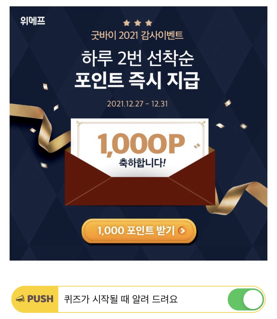 굿바이2021년 올해 마지막 감사이벤트로 OO/OO 11시에 선착순으로 1천포인트를 드립니다. OOOO에 들어갈 단어는 무엇일까요?