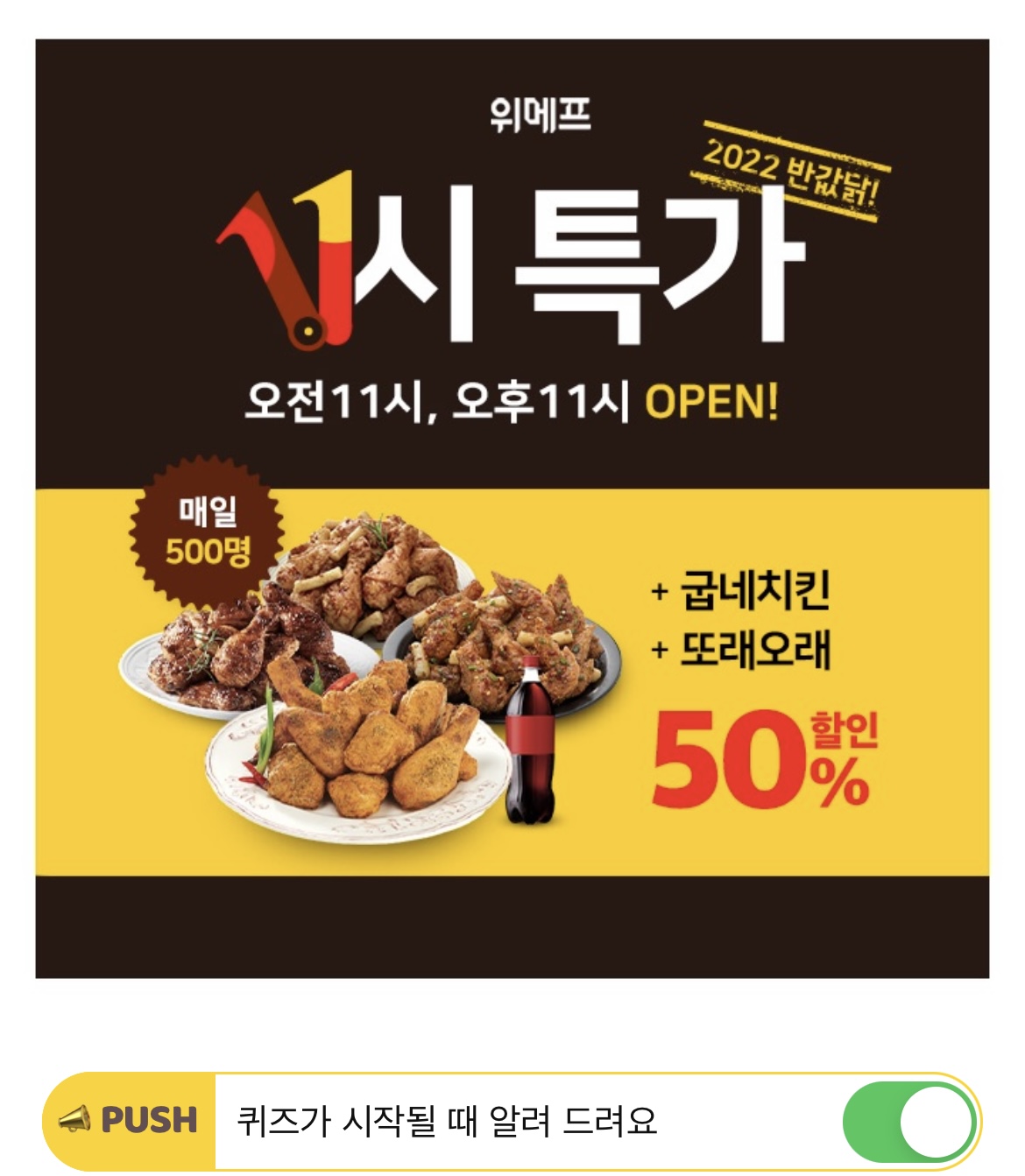 2022년 맞이 1월 10일부터 일주일간 치킨 반값특가! 한정수량으로 진행됩니다. 깜짝이벤트로 OOOOOO을 클릭하여 알림항목을 모두 ON으로 설정하면 응모를 통해 1만명에게 선물을 드리고 있는데요. 빈칸에 들어갈 단어는 무엇일까요? (힌트 : ㅍㅅㅇㄹㅅㅈ)
