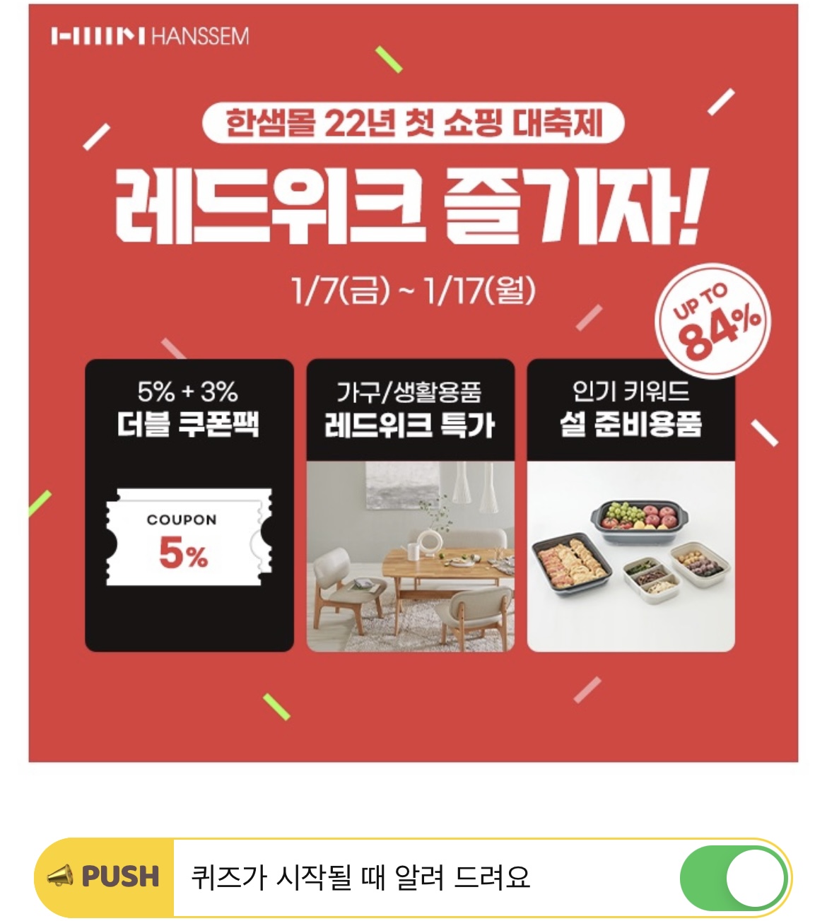 한샘몰 최대혜택 위크! 오직 레드위크 기간에만 매일 10시 선착순 OOOO 쿠폰이 오픈됩니다. 빈칸에 들어갈 단어는 무엇일까요? (힌트 : ㄷㅂㅎㅇ)